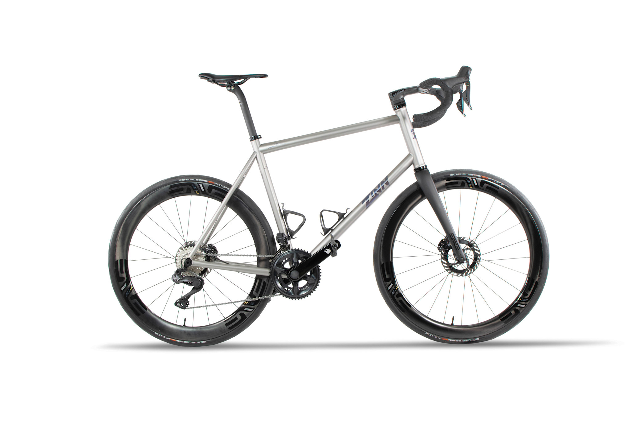 The Zinn Dolomite In-Route Red AXS is our custom Titanium road bike built with Sram Red AXS 2x12 speed electronic shifting components fully internal cable routing for a super clean aesthetic.